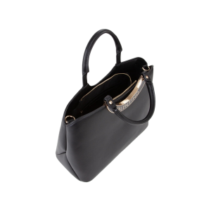 Élégant sac shopping à main avec logo en relief sur une plaque émaillée située sous la poignée.