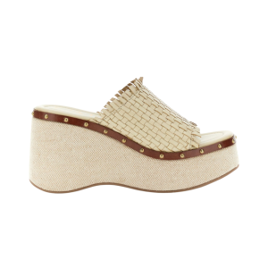 Sandali modello ciabatta in pelle con listini intrecciati e zeppa rivestita. fodera e soletto in pelle per un comfort superiore. tacco alto 9 cm e plateau di 4.5 cm. calzatura ideale per look estivi dallo stile moderno e chic.