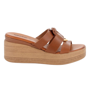 Questi sandali hanno una struttura a ciabatta, elevata dall'accessorio importante che copre la parte superiore del piede, conferendo un look altamente sofisticato. La zeppa è alta e robusta, ma al contempo leggerissima, ideale per slanciare la figura. La suola ha un effetto legno, che dona un tocco naturale e rustico, con venature che ricordano la superficie del legno. Completa il tutto un sottopiede con memory foam.